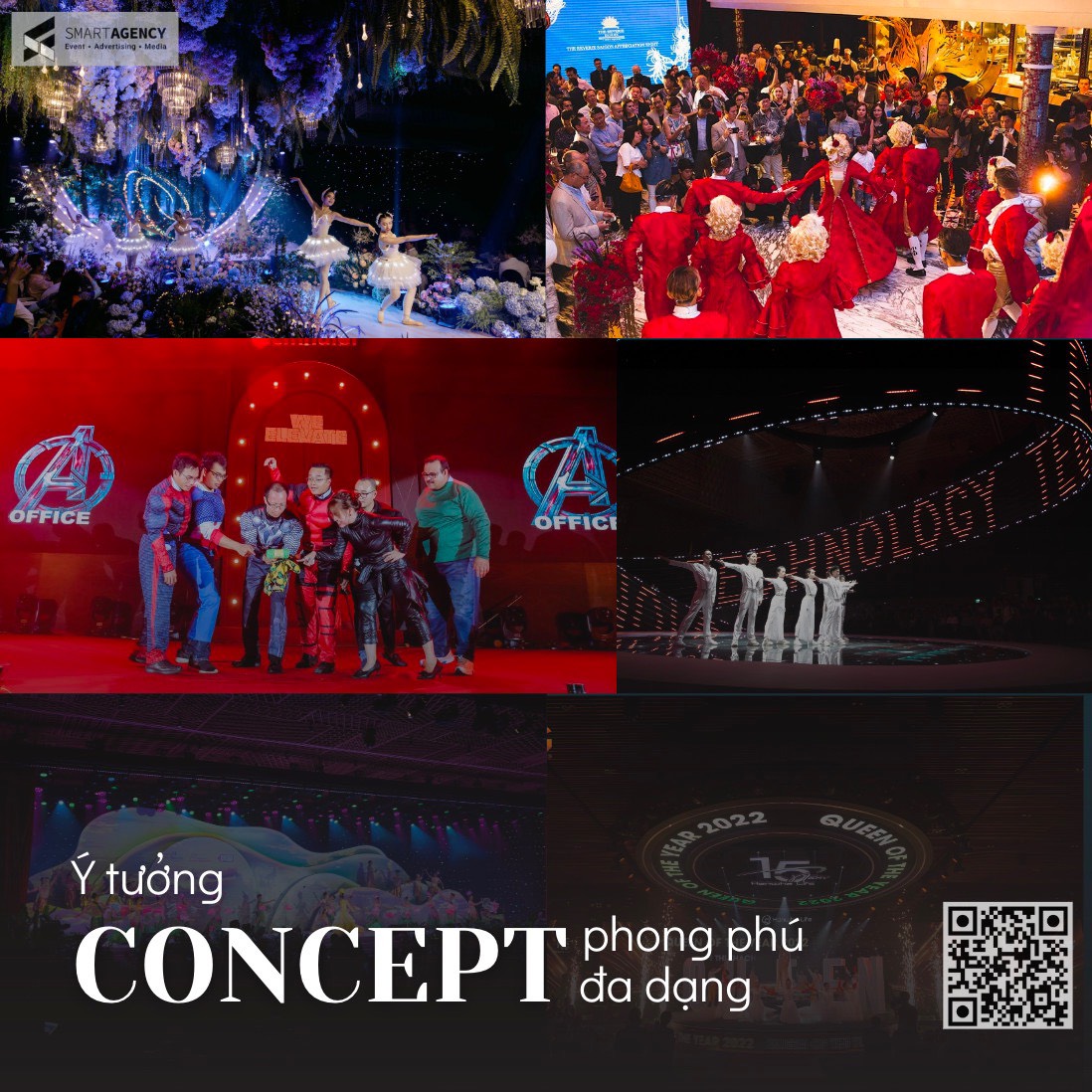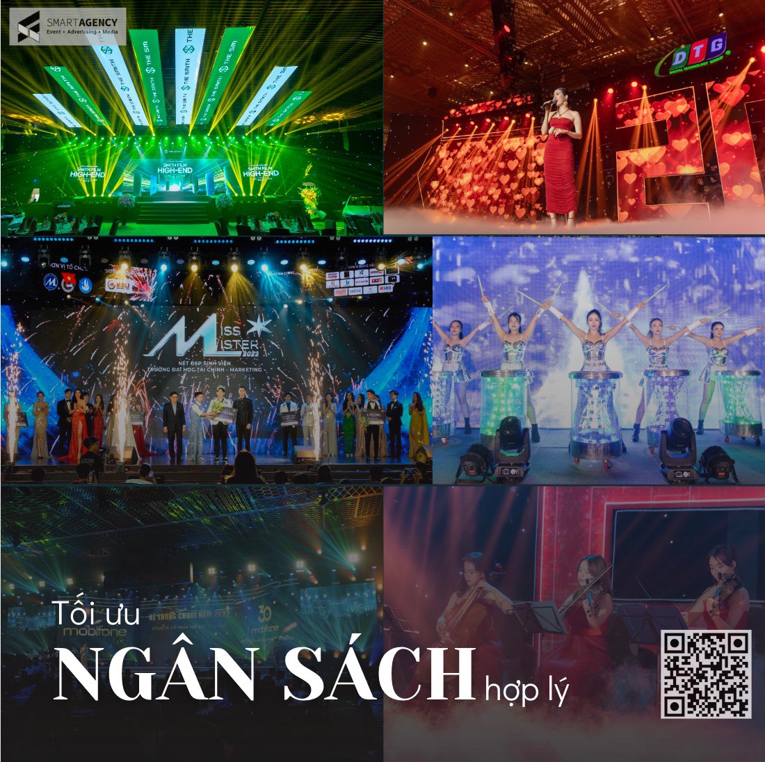 - Dịch vụ trọn gói, tiện lợi: Từ lên ý tưởng, kịch bản, trang trí, cung cấp nhân sự (MC, ban nhạc, vũ đoàn…), âm thanh, ánh sáng, cho đến dịch vụ ăn uống, quay phim, chụp ảnh – tất cả đều được Smart Agency lo liệu chu toàn, giúp bạn tiết kiệm thời gian và công sức.